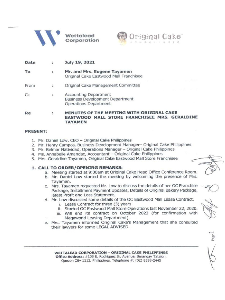 Minutes of The Meeting With Original Cake Eastwood Mall Store Francisee